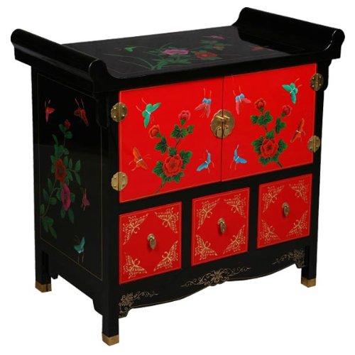 Infuse your decor with Eastern romance when you decorate with this beautiful handcrafted aspen wood storage cabinet. The red lacquer doors of this lovely creation feature exquisite hand-painted designs depicting colorful butterflies cavorting among flowering peony branches. Below, three square pull-out drawers are adorned with ornate butterfly designs rendered in shimmering gold paint. Similar natural scenes ornament the top surface and side panels, setting off the lustrous black lacquer frame and making this piece a pleasure to view from every angle. The Imperial-style antiqued brass latch, handles, and hinges reflect a chic palatial sensibility. Open the doors to 'find ample storage space for keeping your most treasured possessions or everyday necessities. For millennia, the Chinese have regarded the peony as a symbol of feminine grace, while butterflies represent the spirits of star-crossed lovers united at long last. This highly functional cabinet can easily double as a foyer or living room accent and is sure to brighten any room in your home or office. Measures 33 inches wide x 31 inches high x 16 inches long. AsiaEXP brings you handicrafts of exceptional quality from a variety of Eastern cultures, while simultaneously supporting talented craftsmen and their creative traditions. By purchasing this piece you are not only acquiring a beautiful decor accent, but helping to sustain the artisans and their cultural heritage. The handcrafted nature of this item will produce minor differences in design, color and sizing. Subtle variations will occur from piece to piece, adding to the unique quality of individual creations. Measurements may vary slightly.